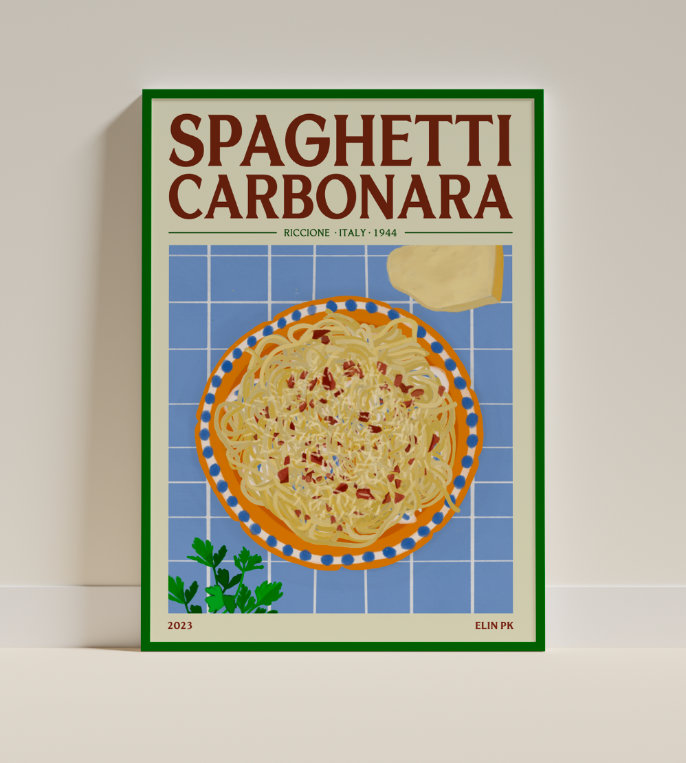 Skapa en smakfull atmosfär i ditt kök eller matsal med vår Elin PK Pasta Carbonara Poster. Denna konstnärliga skapelse fångar hela känslan av den krämiga, ostiga och välsmakande pastarätten. Perfekt för alla matälskare och hemmakockar som vill hylla en av Italiens mest älskade rätter.