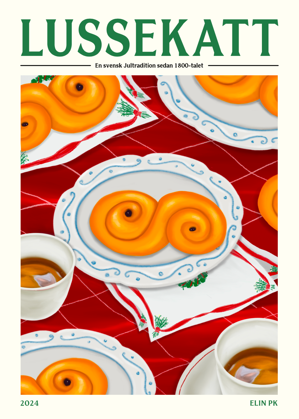 Elin PK Lussekatt Poster i rött, grönt, gult och vitt. Lussekatter har varit en svensk jultradition sedan 1800-talet! Ett måste som julgodis, men nu också som juldektoration! Högkvalitativt print på 180gr FSC certifierat matt papper. Säljs i storlekarna 30x40 cm, 50x70 cm och 70 x 100 cm. Tillverkad i Sverige. Ram ingår ej. Postern är illustrerad av Elin PK.