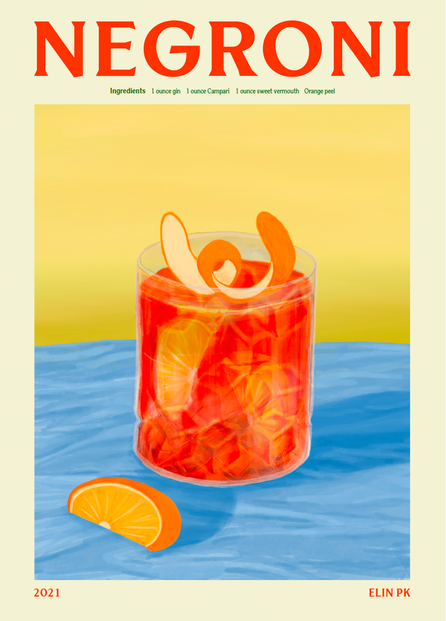 Negroni is a classic cocktail with a sophisticated twist of bitterness and sweetness. Now you can bring this iconic drink into your home as an artistic poster. Elin PK Negroni Drink Poster in red, orange, yellow and blue. High quality print on 180g FSC certified matte paper. Available in sizes 30x40 cm, 50x70 cm and 70x100 cm. Made in Sweden. Frame not included.