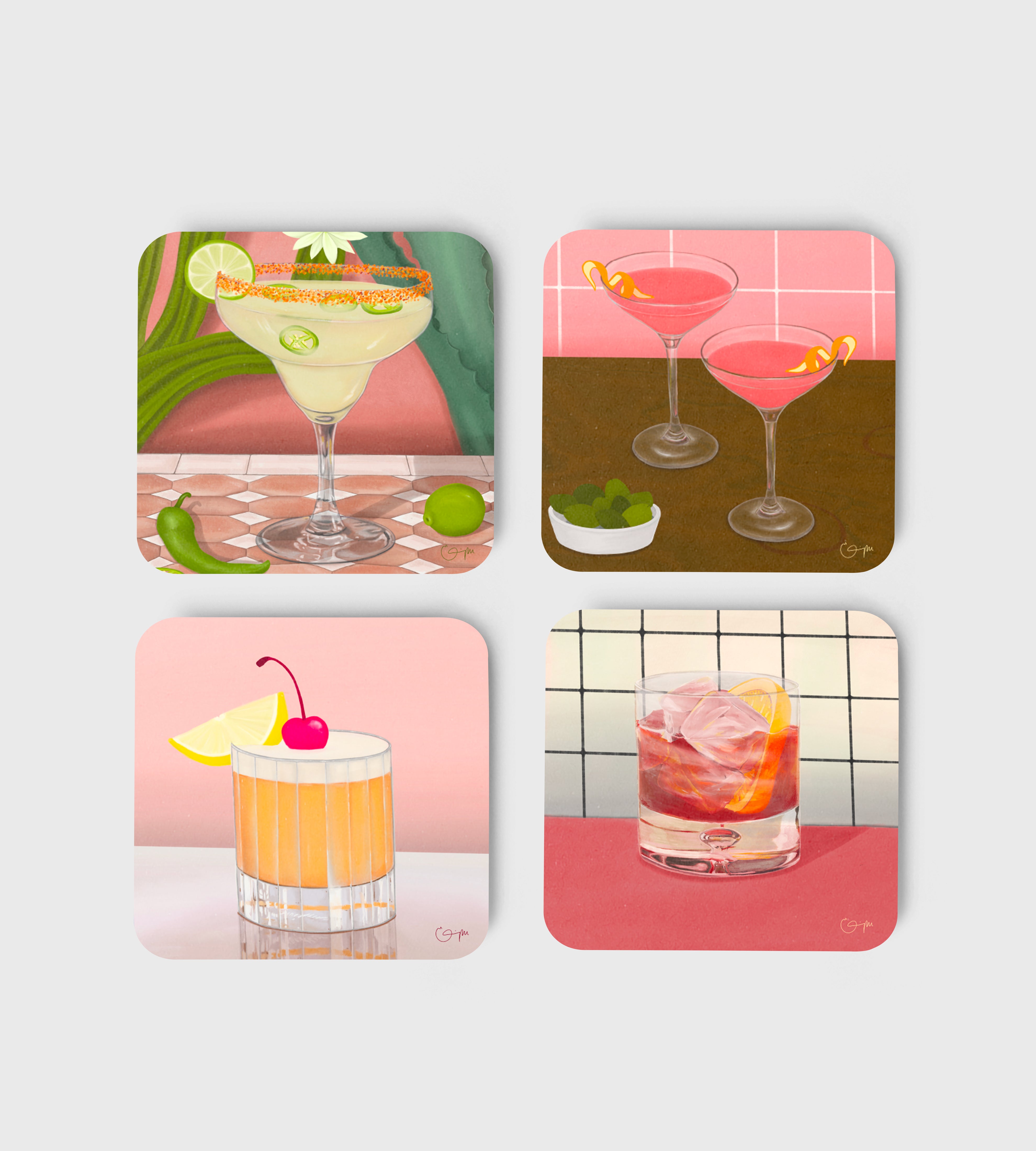 Elin PK Coasters 4-pack mixed pink. Contains 4 coasters made of birch veneer with the motifs Amaretto Sour, Old Fashioned, Cosmopolitan and Spicy Margarita. Made in Sweden.