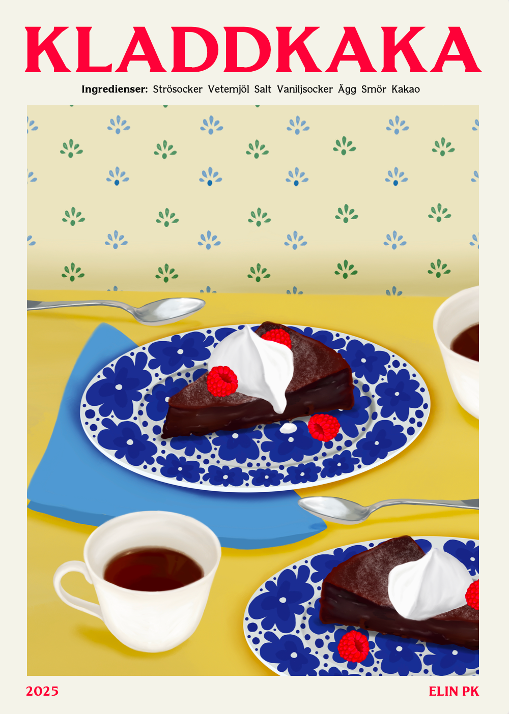 Elin PK Kladdkaka Poster i gult, blått och rött. Högkvalitativt print på 180gr FSC certifierat matt papper. Säljs i storlekarna 30x40 cm, 50x70 cm och 70 x 100 cm. Tillverkad i Sverige. Ram ingår ej.
