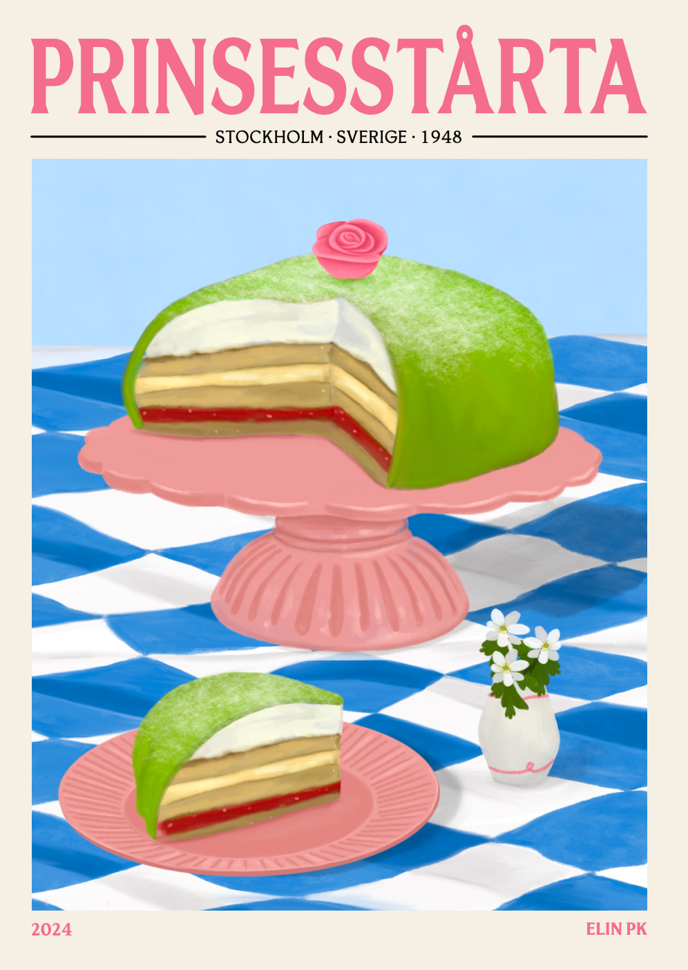 During the early 1900s, food writer and home economics teacher Jenny Åkerström ran a housewife school for young girls in Östermalm in Stockholm. It was here that the recipe for Princess Cake was brought to life. Among the students at the school were Princesses Margaretha, Märtha and Astrid, all of whom were daughters of Prince Carl and Princess Ingeborg. Elin PK Princess Cake Poster in green, pink and blue. High-quality print on 180gr FSC certified matte paper. Sold in sizes 30x40 cm, 50x70 cm and 70 x 100 cm. Made in Sweden. Frame not included.