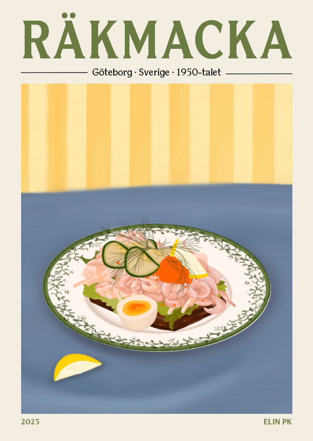 En hyllning till Göteborgs mest klassiska smörgås! Denna poster av Elin PK är inspirerad av That’s Up:s räkmacketävling på Pigalle, där stadens bästa räkmacka korades.
