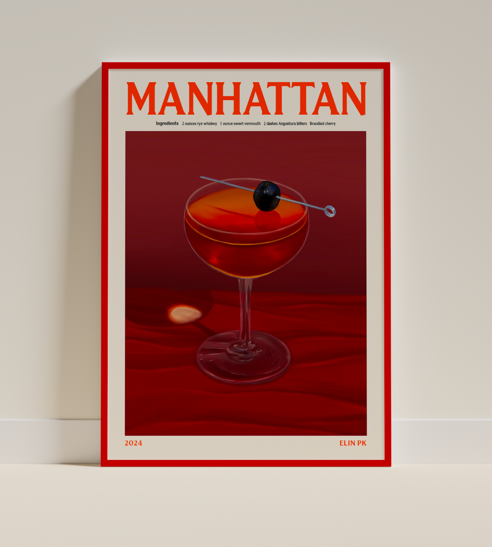 Elin PK Manhattan Drink Poster i röda toner. Högkvalitativt print på 180gr FSC certifierat matt papper. Säljs i storlekarna 30x40 cm, 50x70 cm och 70 x 100 cm. Tillverkad i Sverige. Ram ingår ej.