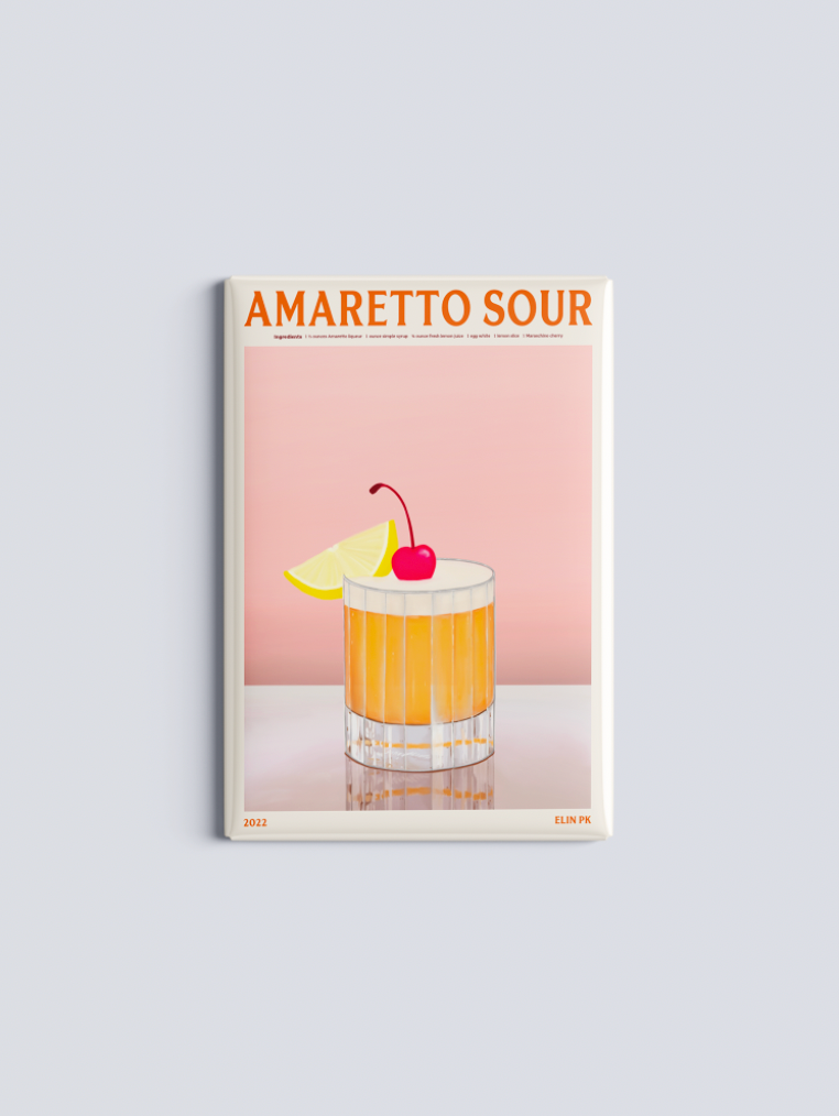 Elin PK Amaretto Sour Kylskåpsmagnet i rosa, vitt, orange och gult. Motivet visar en Amaretto Sour med en citron skiva och ett körsbär på toppen. Kylskåpsmagneten är 8x5 cm.