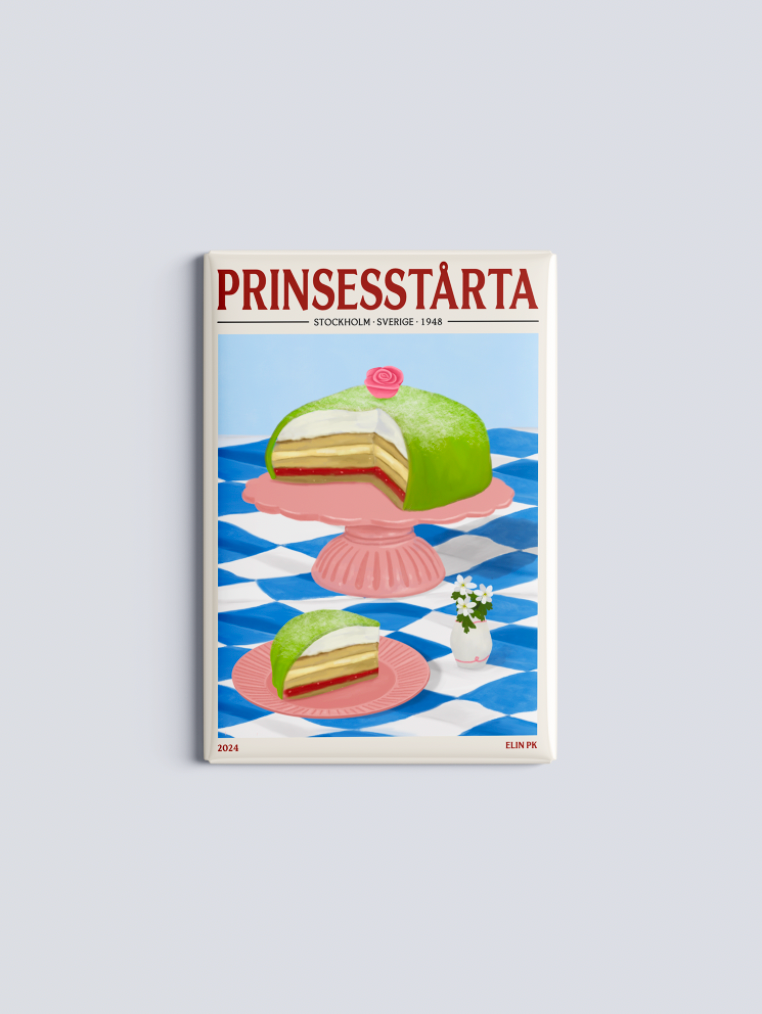 Elin PK Prinsesstårta Kylskåpsmagnet i grönt, rosa och blått. Motivet visar en Prinsesstårta på ett rosa fat med fot, ståendes på en blå/vit rutig duk. Kylskåpsmagneten är 8x5 cm.